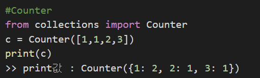 - Counter 함수 : list 안에 값들이 몇개씩 있는지