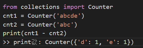 > 만일 list 자료형(중복허용)일 경우, 차집합과 같은 기능을 수행하려면 counter 함수를 이용할 수 있다.