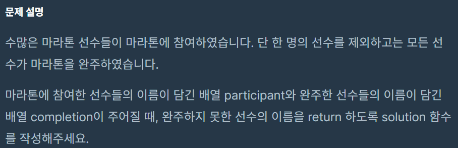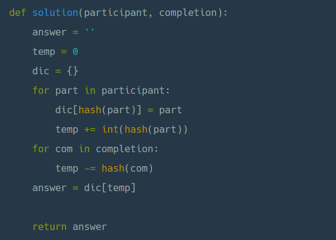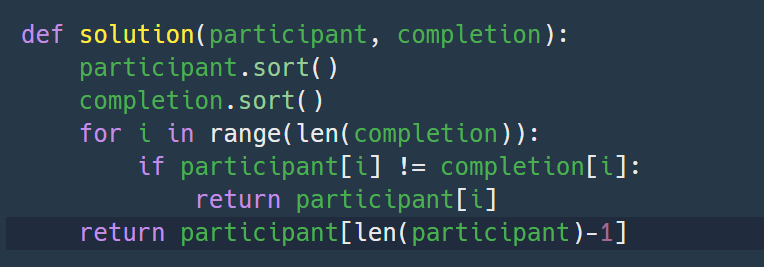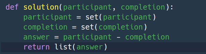 for 함수를 이용해서 completion 안에 있는 list 원소들과 participant 원소를 비교한다는 frame